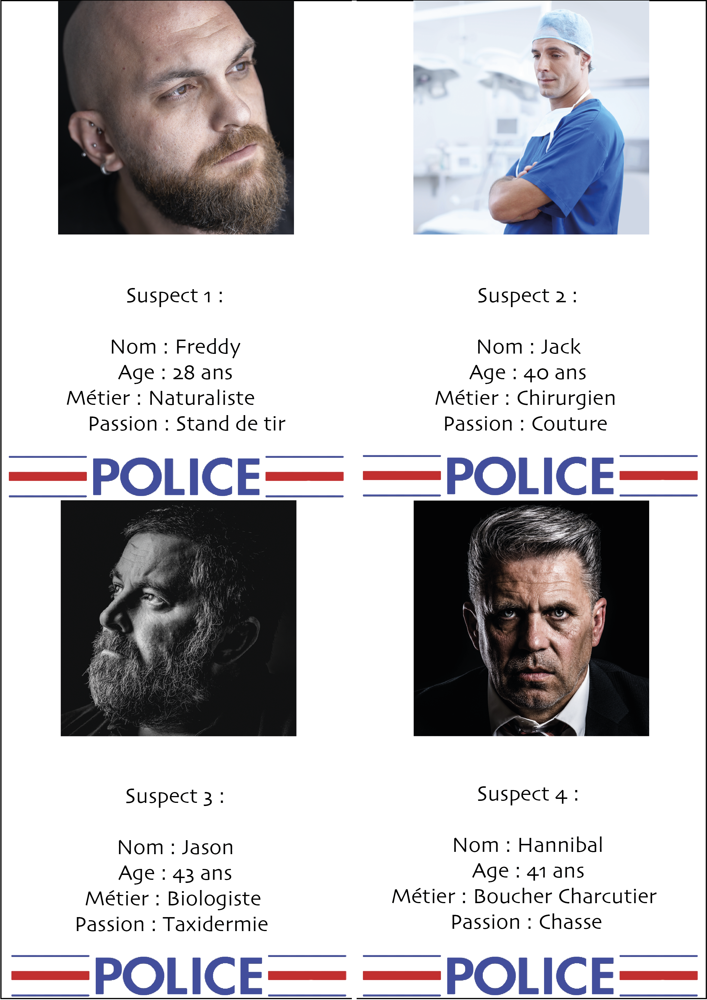 Suite à notre début d'enquête, nous avons pu identifier quatre suspects. Nous avons récupéré plusieurs informations à leur sujet et nous les mettons à votre disposition.